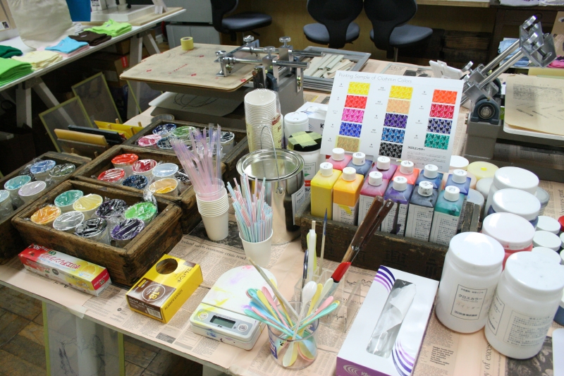 製版機、刷り台、プレス機などのシルクスクリーン設備を常備したHOW HOUSEの工房で、
